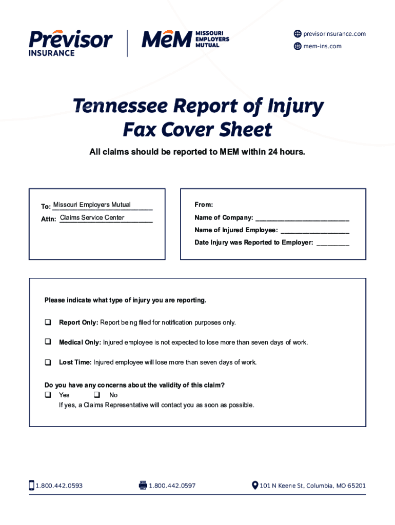 Previsorinsurance.com begins.com Tennessee Report of Injury Fax Cover Sheet All claims should be reported to ME within 24 hours. Missouri Employers Mutual To:___From:Claims Service Center Attn:___Name