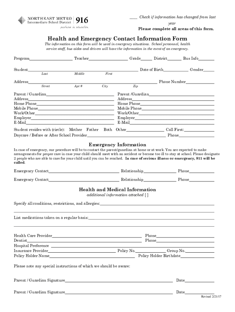 Please complete all areas of this form. Health and Emergency Contact Information Form