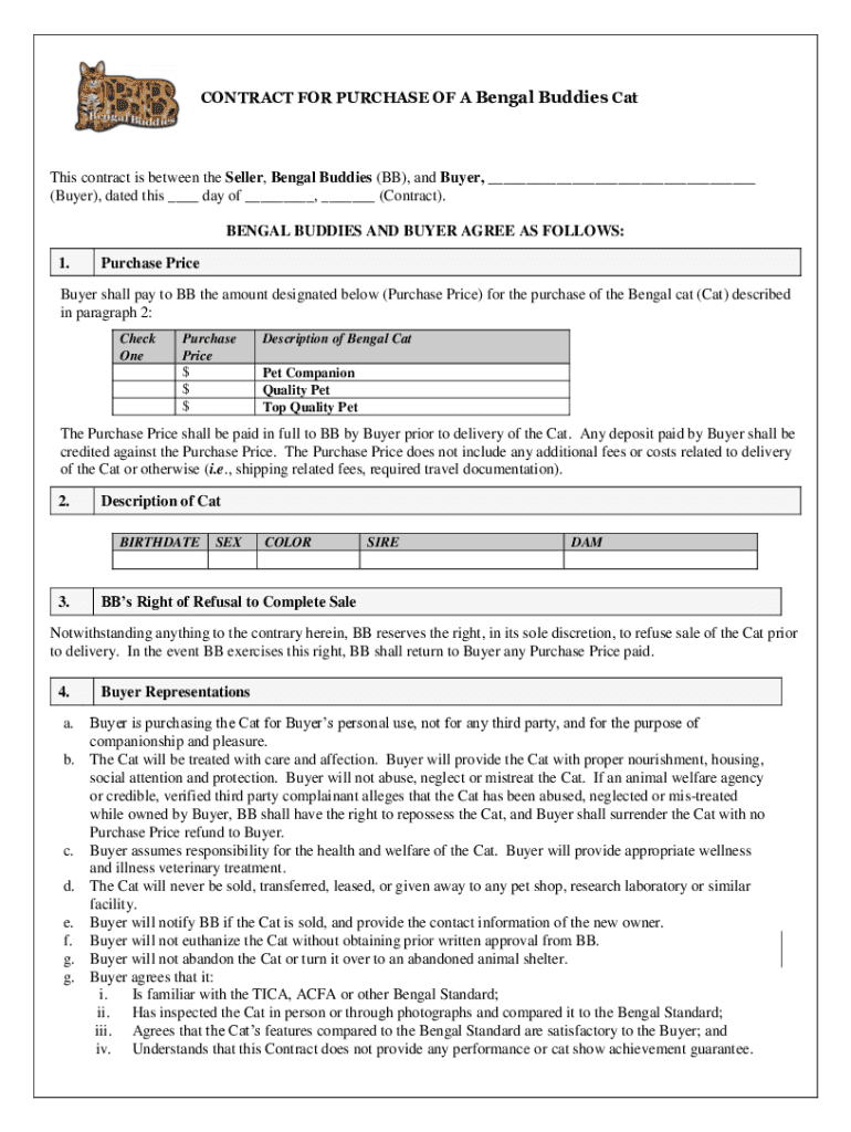 CONTRACT FOR PURCHASE OF A Bengal Buddies Catches contract is between the Seller, Bengal Buddies (BB), and Buyer, ___ (Buyer), dated this ___ day of ___, ___ (Contract). BENGAL BUDDIES AND BUYER AGREE