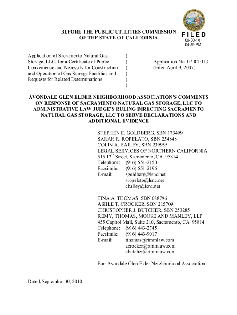 BEFORE THE PUBLIC UTILITIES COMMISSION OF THE STATE OF CALIFORNIAApplication of Sacramento Natural Gas Storage, LLC, for a Certificate of Public Convenience and Necessity for Construction and Operation