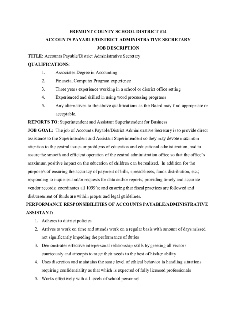 FREMONT COUNTY SCHOOL DISTRICT #14 ACCOUNTS PAYABLE/DISTRICT ADMINISTRATIVE SECRETARY JOB DESCRIPTION TITLE: Accounts Payable/District Administrative Secretary QUALIFICATIONS: 1. Associates Degree