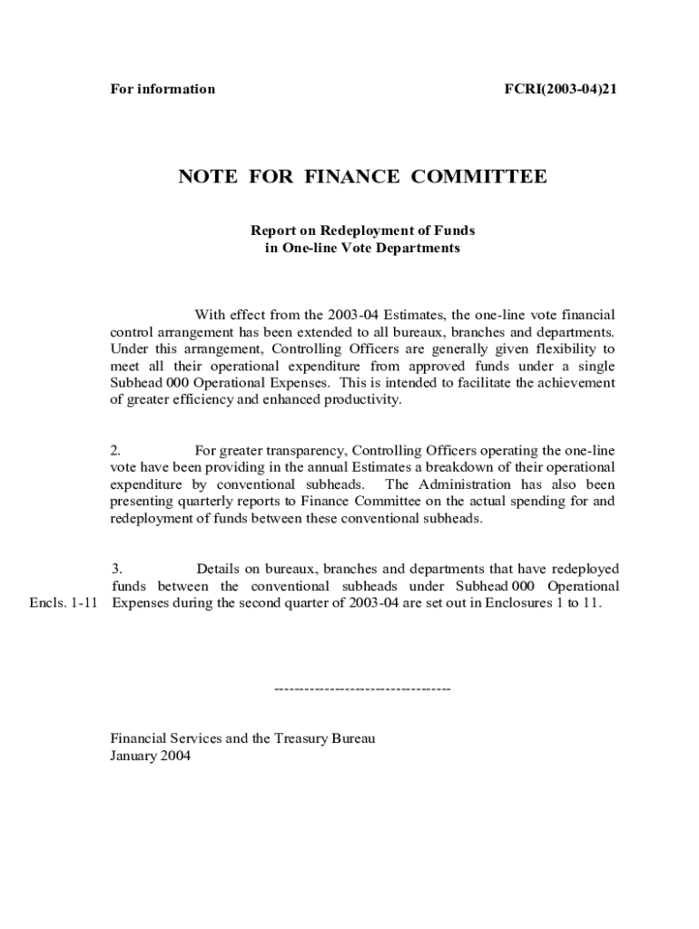 For informationFCRI(200304)21NOTE FOR FINANCE COMMITTEE Report on Redeployment of Funds in Online Vote DepartmentsWith effect from the 200304 Estimates, the online vote financial control arrangement