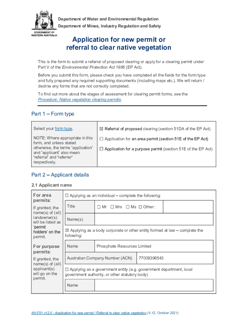 Department of Water and Environmental Regulation Department of Mines, Industry Regulation and SafetyApplication for new permit or referral to clear native vegetation This is the form to submit a referral