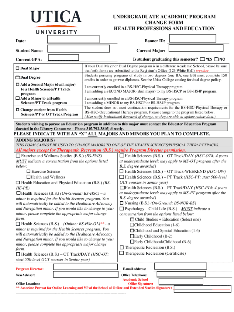 UNDERGRADUATE ACADEMIC PROGRAM CHANGE FORM HEALTH PROFESSIONS AND EDUCATION Date:Banner ID:Student Name:Current Major: Is student graduating this semester? YES Current GPA: Dual Major Dual Degree