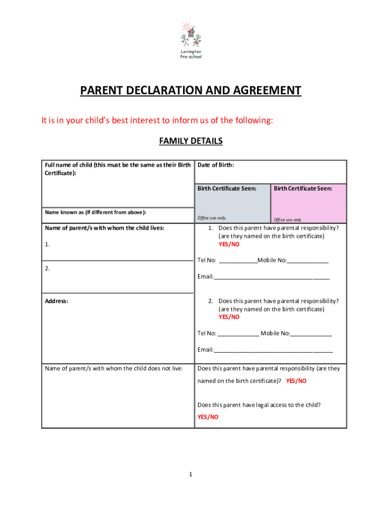 PARENT DECLARATION AND AGREEMENT It is in your children the best interest to inform us of the following: FAMILY DETAILS Full name of child (this must be the same as their Birth Certificate):Name known