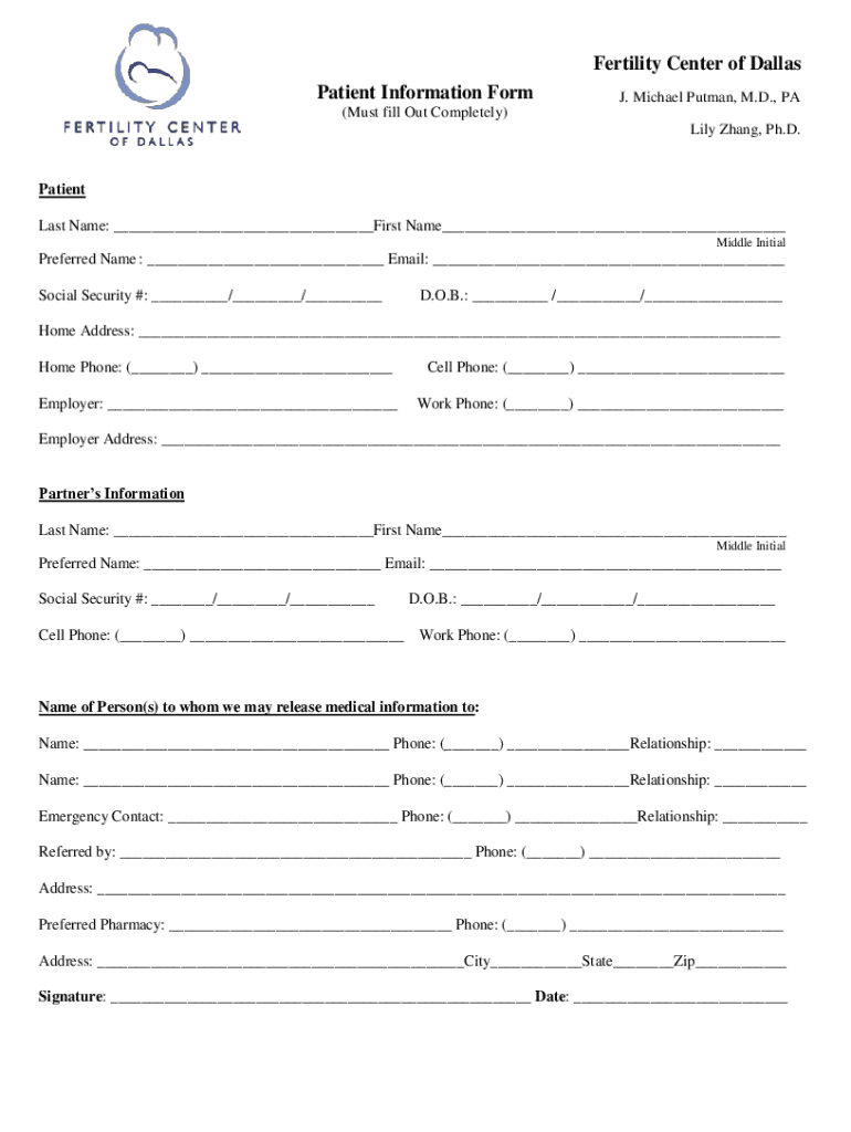 Fertility Center of Dallas Patient Information Form. Michael Put man, M.D., PA(Must fill Out Completely) Lily Zhang, Ph.D. Patient Last Name: ___First Name___ Middle InitialPreferred Name : ___ Email: