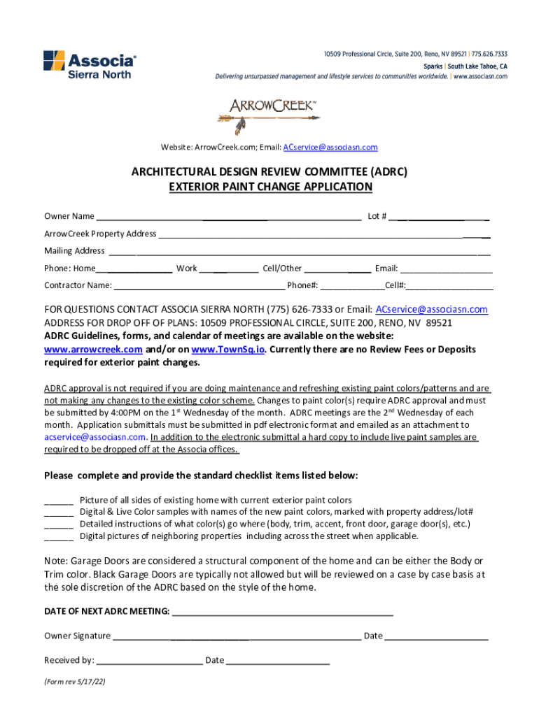 Website: ArrowCreek.com; Email: ACservice@associasn.comARCHITECTURAL DESIGN REVIEW COMMITTEE (ARC) EXTERIOR PAINT CHANGE APPLICATION Owner Name___Lot #__ ____Arrow Creek Property Address _____Mailing