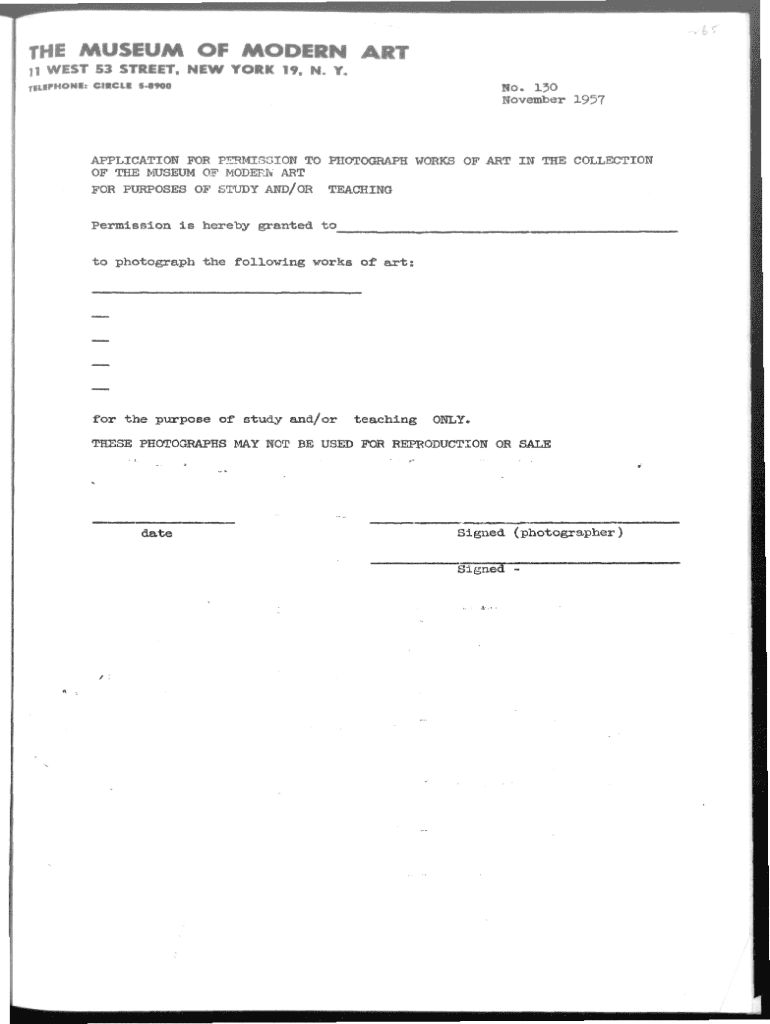 TfLlFHONI: CII CLI S490QNo.1^0November 1957APPLICATION FOR PERMISSION TO PHOTOGRAPH WORKS OP ART IN THE COLLECTION