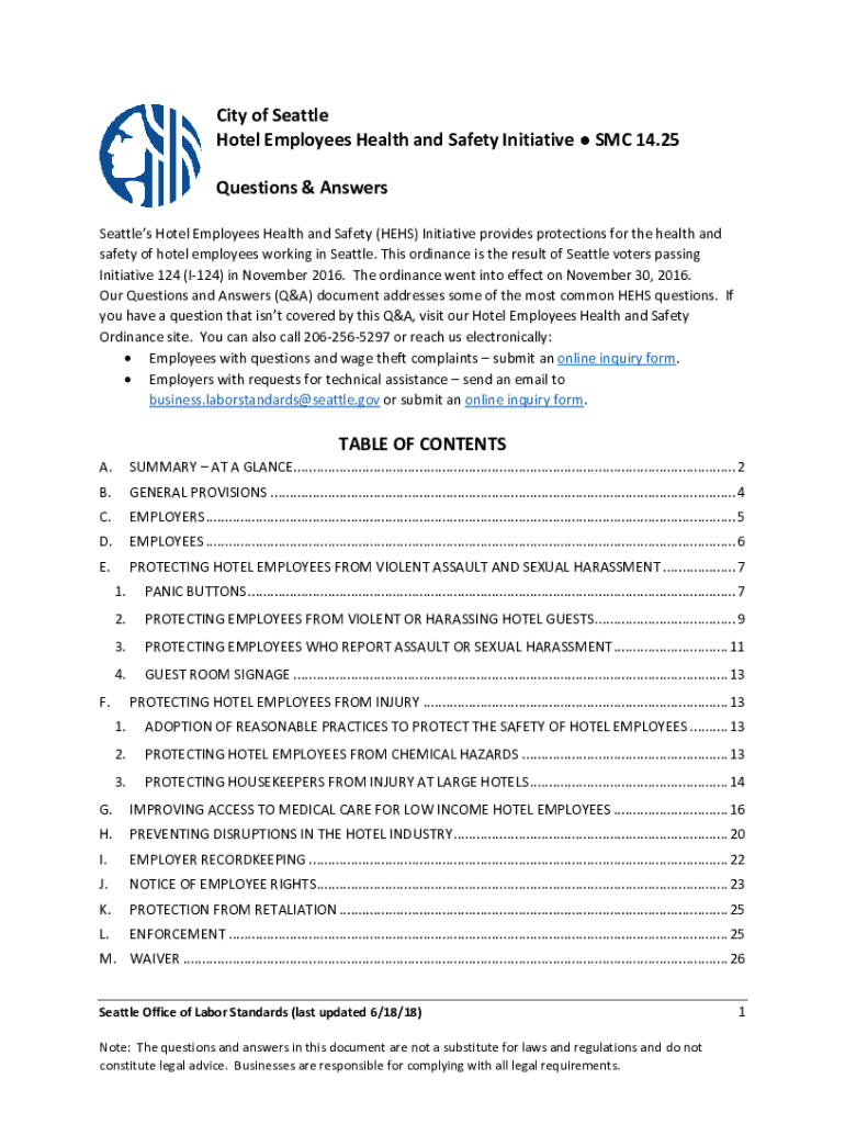 City of Seattle Hotel Employees Health and Safety Initiative SMC 14.25 Questions & Answers Seattle's Hotel Employees Health and Safety (HERS) Initiative provides protections for the health and safety