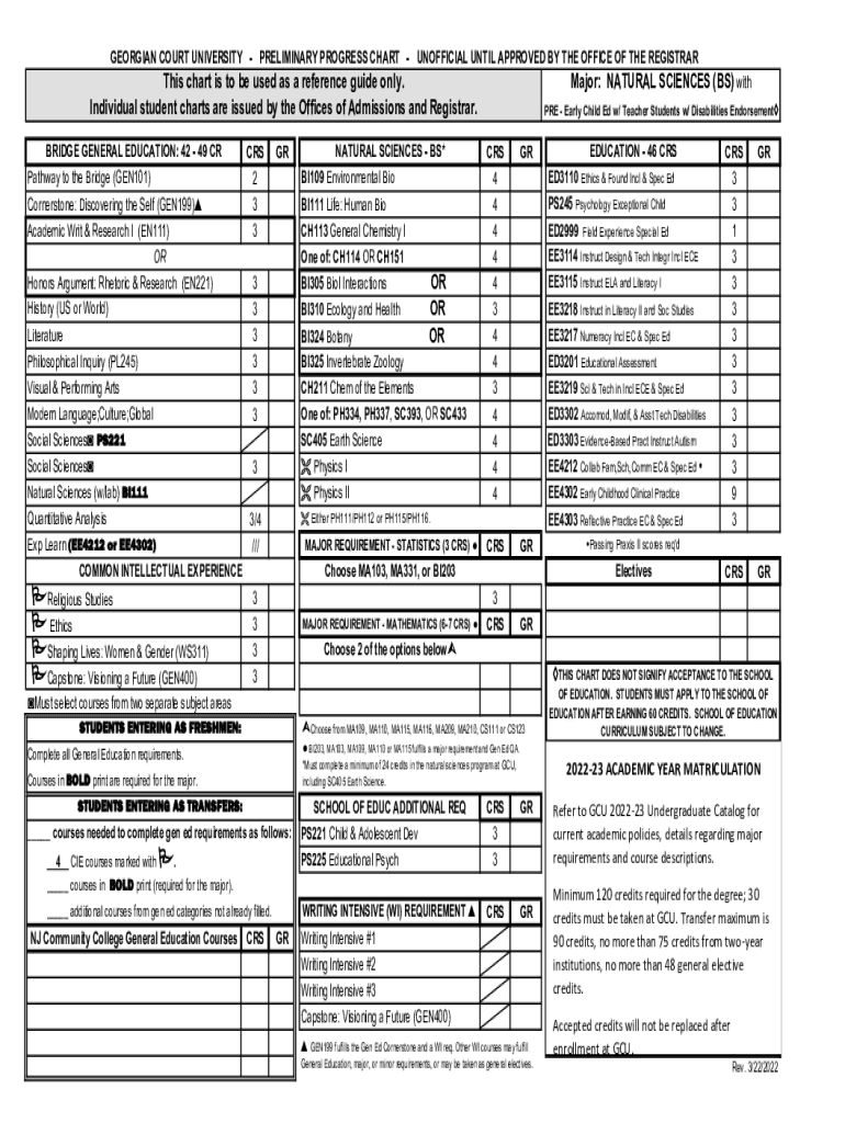 GEORGIAN COURT UNIVERSITY PRELIMINARY PROGRESS CHART UNOFFICIAL UNTIL APPROVED BY THE OFFICE OF THE Registrants chart is to be used as a reference guide only.