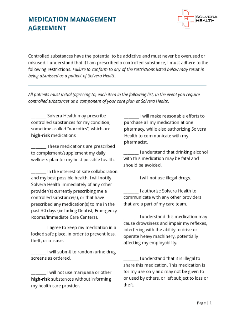MEDICATION MANAGEMENT AGREEMENTControlled substances have the potential to be addictive and must never be overused or misused. I understand that if I am prescribed a controlled substance, I must adhere