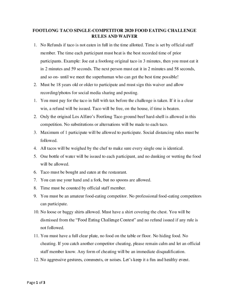 FOOTLING TACO SINGLECOMPETITOR 2020 FOOD EATING CHALLENGE RULES AND WAIVER 1. No Refunds if taco is not eaten in full in the time allotted. Time is set by official staff member. The time each participant
