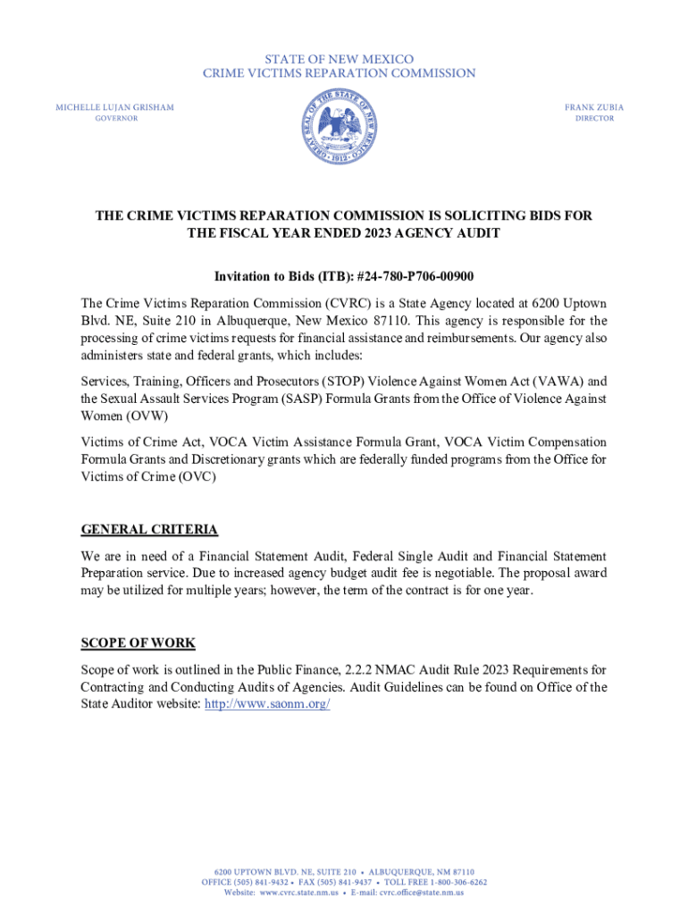 THE CRIME VICTIMS REPARATION COMMISSION IS SOLICITING BIDS FOR THE FISCAL YEAR ENDED 2023 AGENCY AUDIT Invitation to Bids (ITB): #24780P70600900 The Crime Victims Reparation Commission (CRC) is a