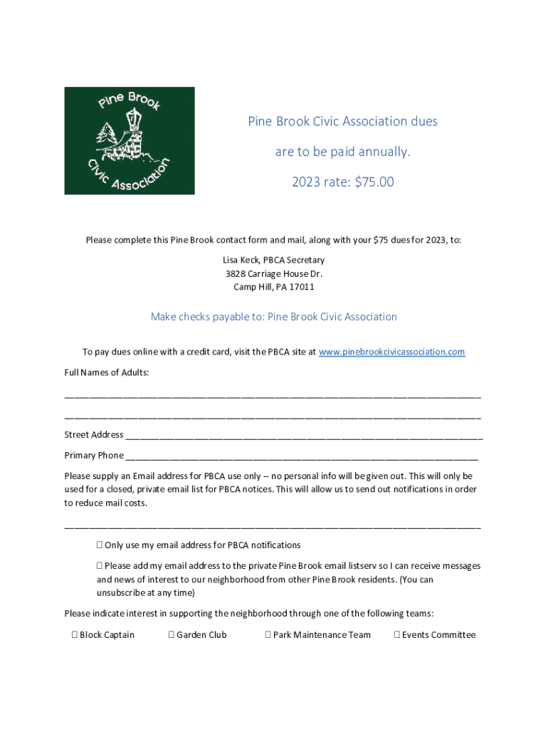 Pine Brook Civic Association dues are to be paid annually. 2023 rate: $75.00Please complete this Pine Brook contact form and mail, along with your $75 dues for 2023, to: Lisa Keck, PBA Secretary 3828