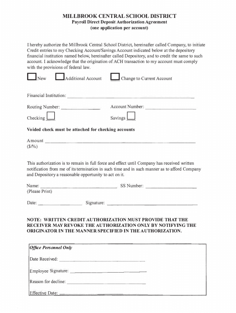 FALLBROOK CENTRAL SCHOOL DISTRICT Payroll Direct Deposit A Utah ordination A agreement (one application per account)I hereby authorize the Mill brook Central School District, hereinafter called Company,