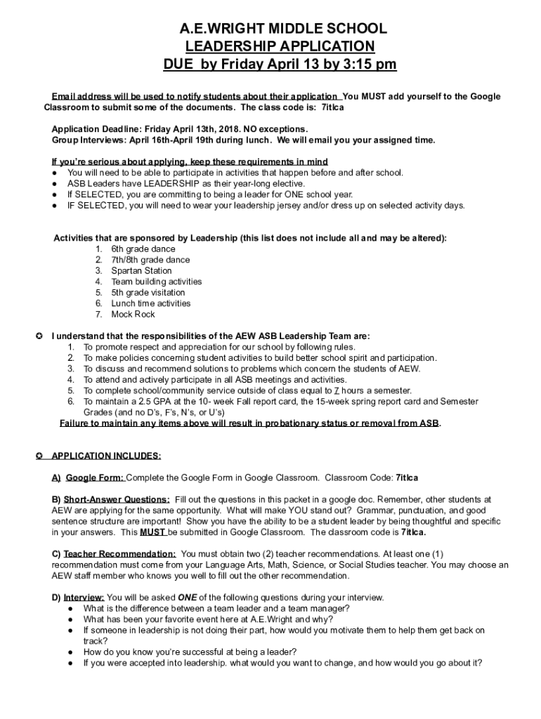 A.E.WRIGHT MIDDLE SCHOOL LEADERSHIP APPLICATION DUE by Friday, April 13 by 3:15 pm Email address will be used to notify students about their application You MUST add yourself to the Google Classroom