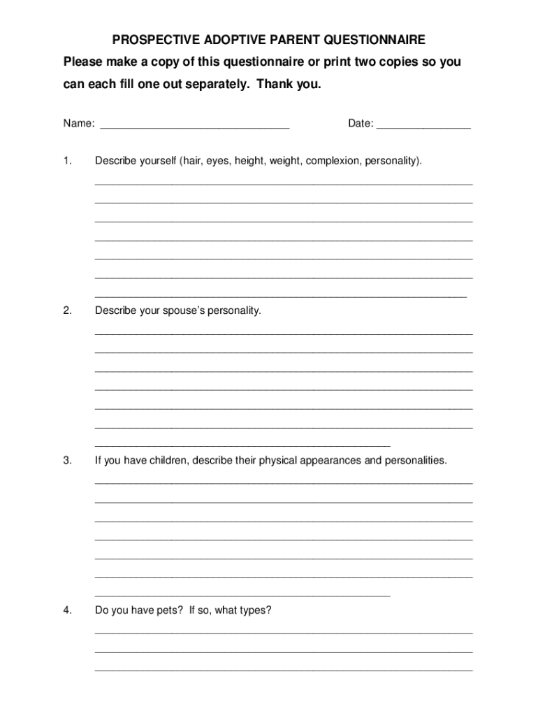 PROSPECTIVE ADOPTIVE PARENT QUESTIONNAIRE Please make a copy of this questionnaire or print two copies, so you can each fill one out separately. Thank you. Name: ___1. Date: ___Describe yourself (hair,