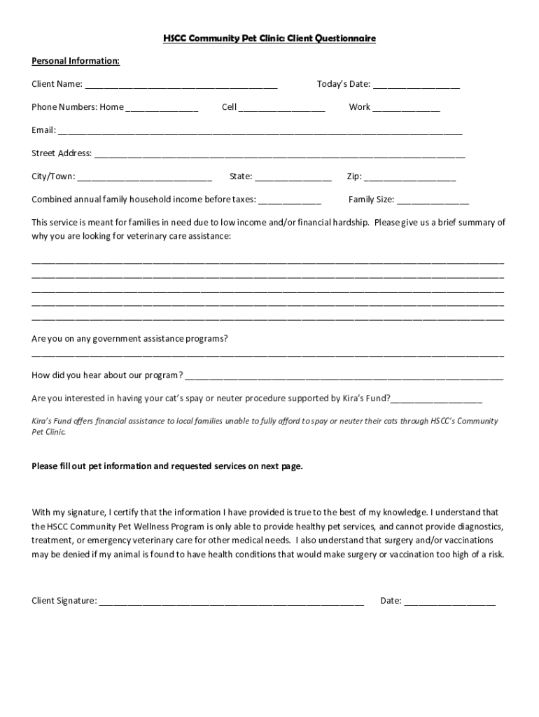 HSBC Community Pet Clinic: Client Questionnaire Personal Information: Client Name: ___ Phone Numbers: Home ___Today's Date: ___Cell ___Work ___Email: ___ Street Address: ___ City/Town: ___State: ___Combined