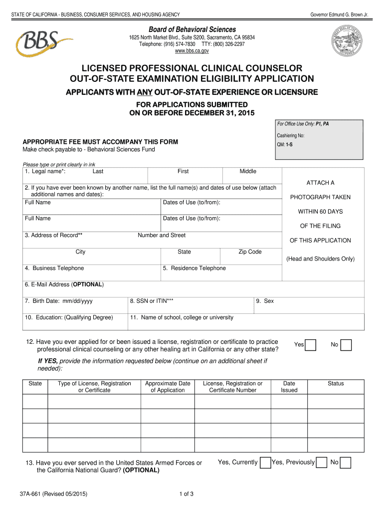 STATE OF CALIFORNIA BUSINESS, CONSUMER SERVICES AND HOUSING AGENCY Governor Edmund G. Brown Jr. Board of Behavioral Sciences 1625 North Market Blvd., Suite S200, Sacramento, CA 95834 Telephone: (916)