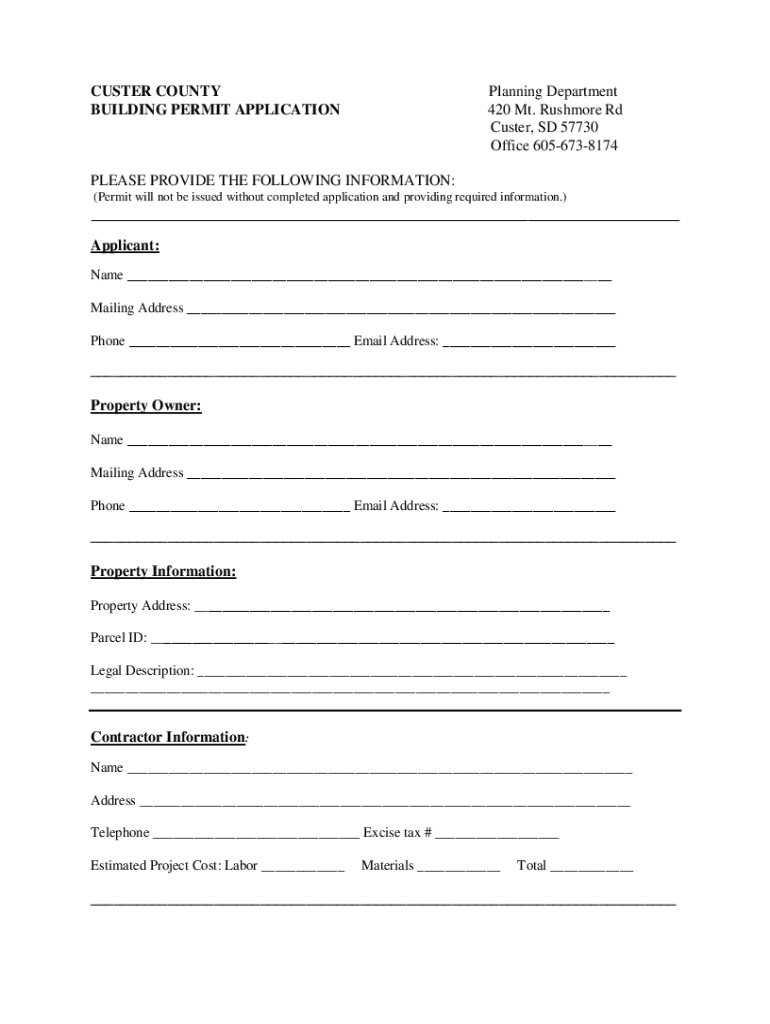 CUSTER COUNTY BUILDING PERMIT APPLICATIONPlanning Department 420 Mt. Rushmore Rd Custer, SD 57730 Office 6056738174PLEASE PROVIDE THE FOLLOWING INFORMATION: (Permit will not be issued without completed