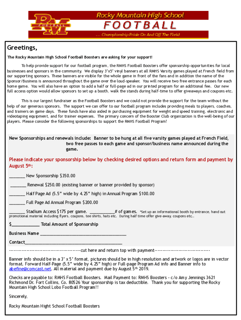 Greetings, The Rocky Mountain High School Football Boosters are asking for your support! To help provide support for our football program, the RMS Football Boosters offer sponsorship opportunities