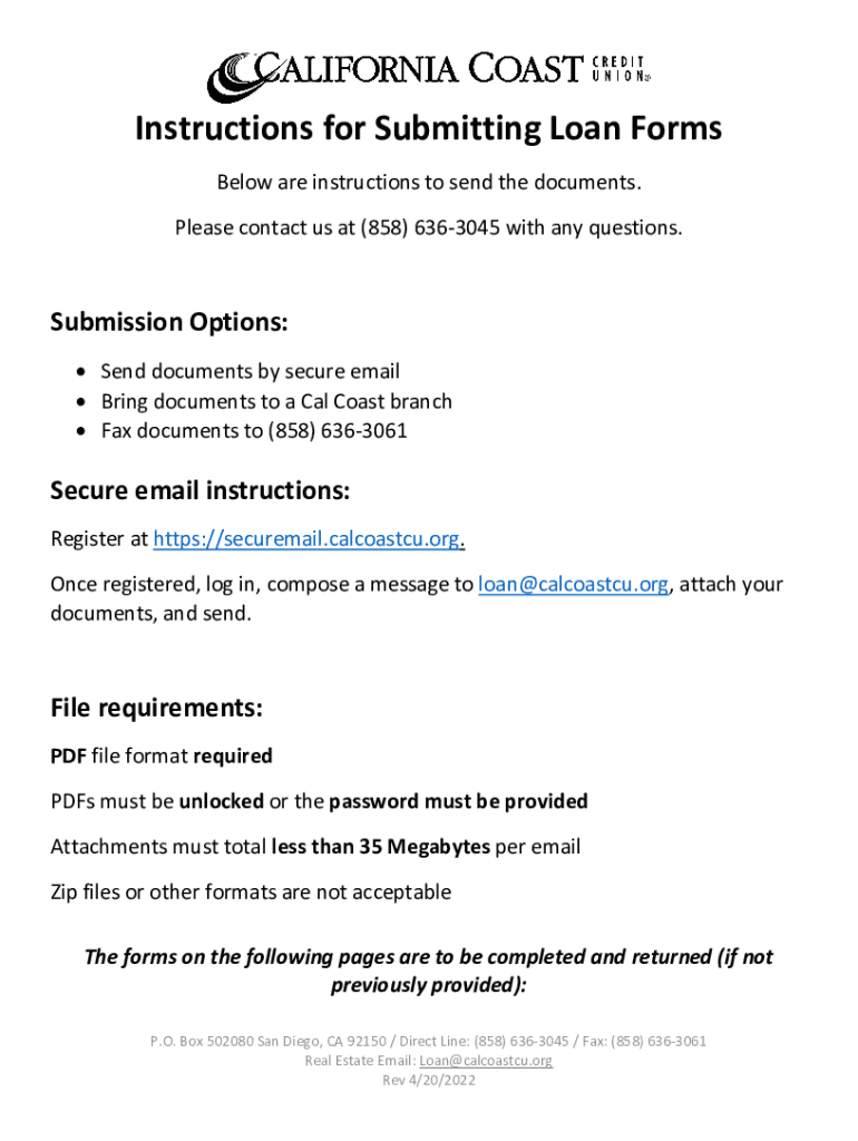 CALIFORNIA Coasts To J. 1Instructions for Submitting Loan Forms Below are instructions to send the documents. Please contact us at (858) 6363045 with any questions. Submission Options: Send documents