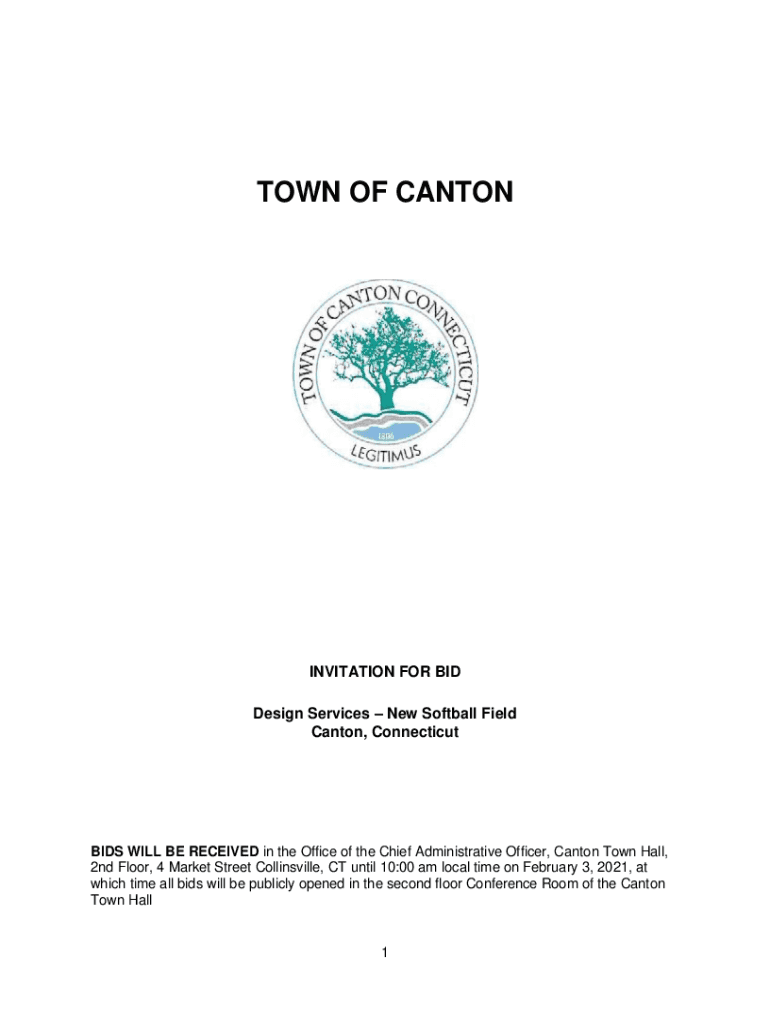TOWN OF CANTONINVITATION FOR BID Design Services New Softball Field Canton, ConnecticutBIDS WILL BE RECEIVED in the Office of the Chief Administrative Officer, Canton Town Hall, 2nd Floor, 4 Market
