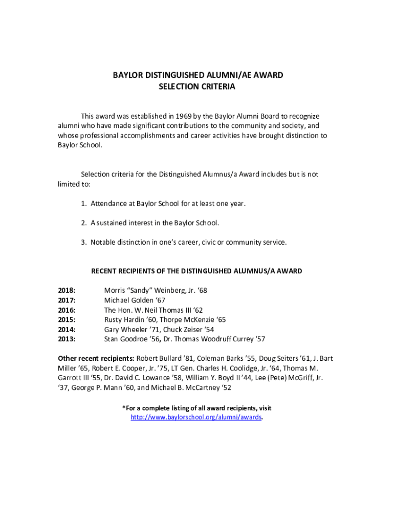 Get the free baylor distinguished alumni/ae award selection criteria