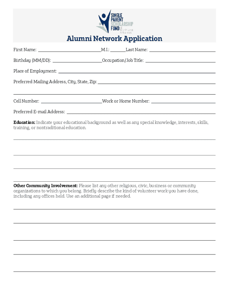 Alumni Network Application First Name:M.I.:Last Name:Birthday (MM/DD):Occupation/Job Title:Place of Employment: Preferred Mailing Address, City, State, Zip:Cell Number:Work or Home Number:Preferred