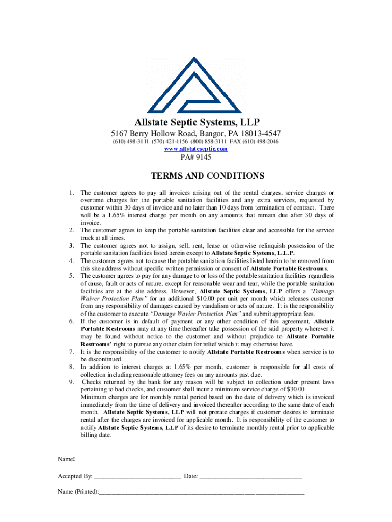 Allstate Septic Systems, LLP 5167 Berry Hollow Road, Bangor, PA 180134547 (610) 4983111 (570) 4211156 (800) 8583111 FAX (610) 4982046www.allstateseptic.coma# 9145TERMS AND CONDITIONS 1.2. 3. 4. 5.6.7.