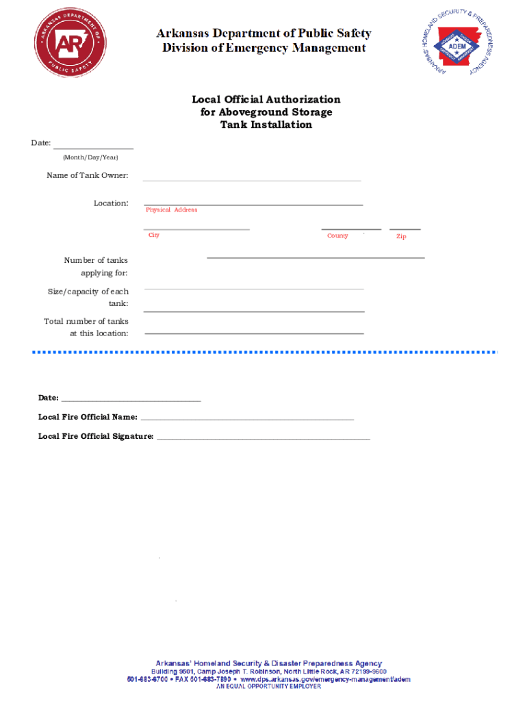 Local Official Authorization for Above ground Storage Tank Installation Date: (Month/Day/Year)Name of Tank Owner: Location:Physical AddressCityCountyNumber of tanks applying for: Size/capacity of