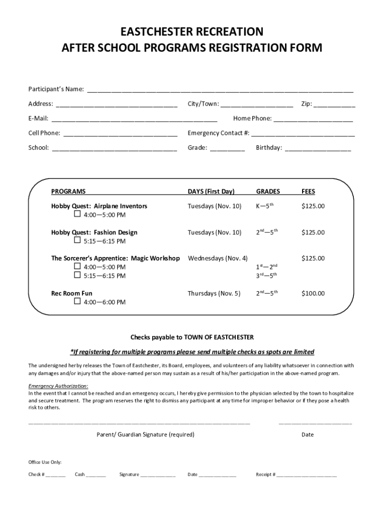 EASTCHESTER RECREATION AFTER SCHOOL PROGRAMS REGISTRATION FORM Participants Name: ___ Address: ___City/Town: ___Email: ___Zip: ___Home Phone: ___Cell Phone: ___Emergency Contact #: ___School: ___Grade:
