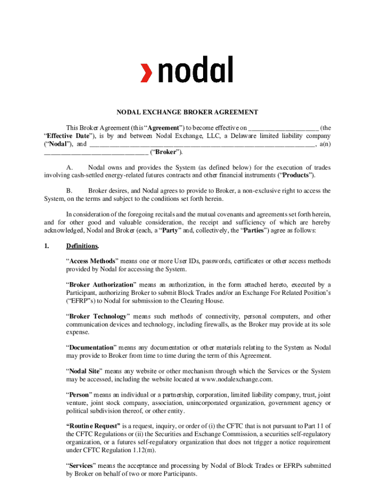 NODAL EXCHANGE BROKER AGREEMENT This Broker Agreement (this Agreement) to become effective on ___ (the Effective Date), is by and between Nodal Exchange, LLC, a Delaware limited liability company