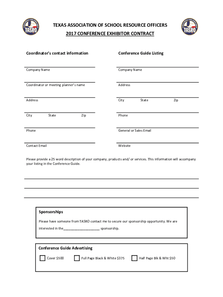 2017 CONFERENCE EXHIBITOR CONTRACTCoordinators contact informationConference Guide ListingCompany Accompany NameCoordinator or meeting planners nameAddressAddressCityCityStateZipStateZipPhonePhoneGeneral