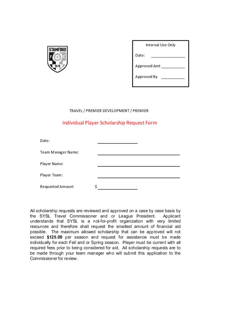 Internal Use Only Date:___Approved Amt ___ Approved By ___TRAVEL / PREMIER DEVELOPMENT / PREMIERIndividual Player Scholarship Request Form Date: Team Manager Name: Player Name: Player Team: Requested