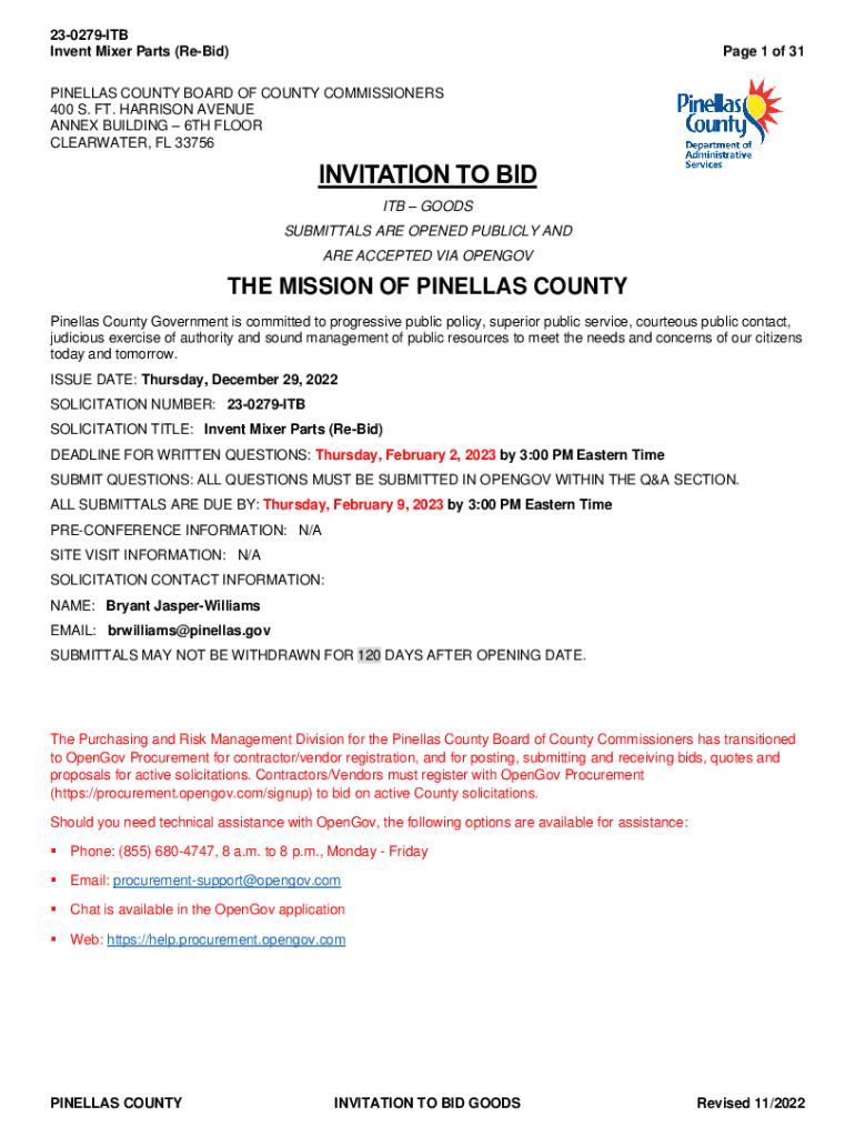 230279ITB Invent Mixer Parts (Rebid)Page 1 of 31PINELLAS COUNTY BOARD OF COUNTY COMMISSIONERS 400 S. FT. HARRISON AVENUE ANNEX BUILDING 6TH FLOOR CLEARWATER, FL 33756INVITATION TO BID ITB GOODS SUBMITTALS