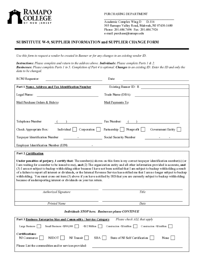 PURCHASING DEPARTMENT ___ Academic Complex Wing D D116 505 Ramp Valley Road, Yahweh, NJ 074301680 Phone: 201.684.7496 Fax: 201.684.7926 email: purchase@ramapo.eduSUBSTITUTE W9, SUPPLIER INFORMATION