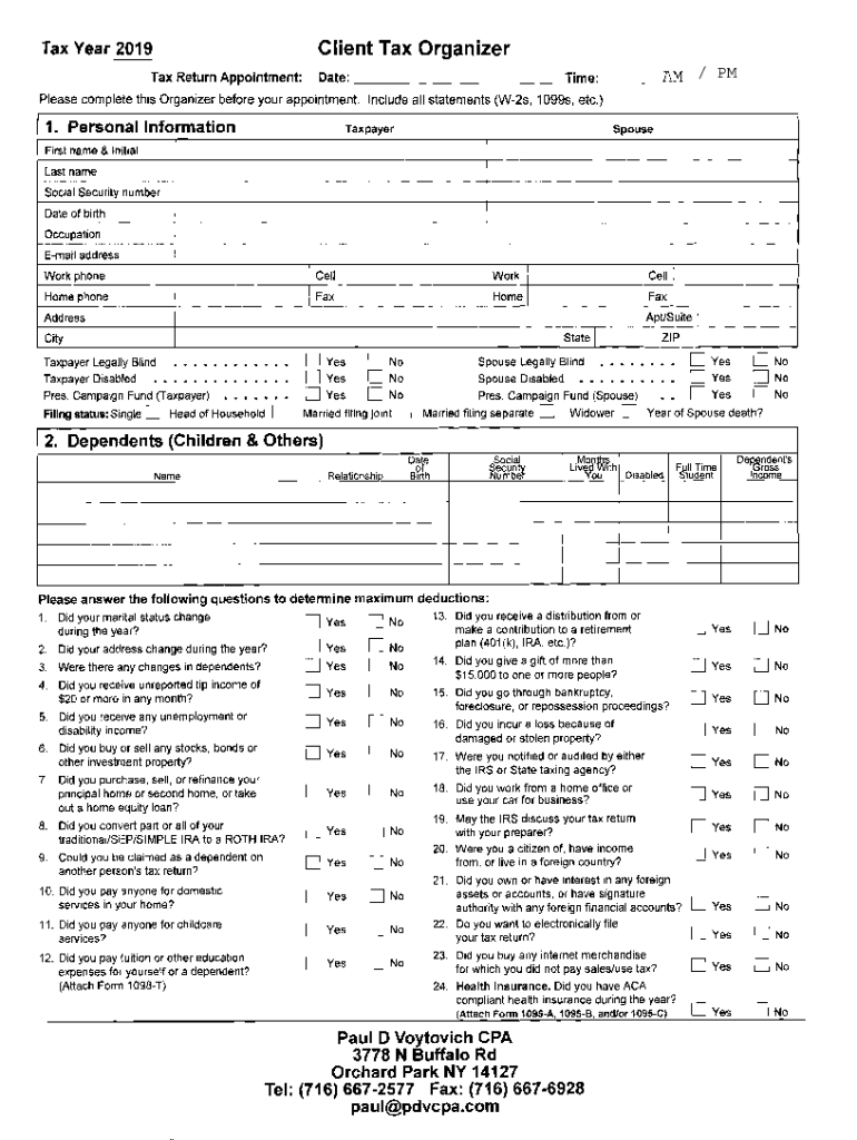 Client Tax Organizer Year 2019Tax Return Appointment:Date:/ Pastime:Please complete this Organizer before your appointment. Include all statements (W2s, 1099s, etc.)1. Personal InformationTaxpayerSpouseFirst