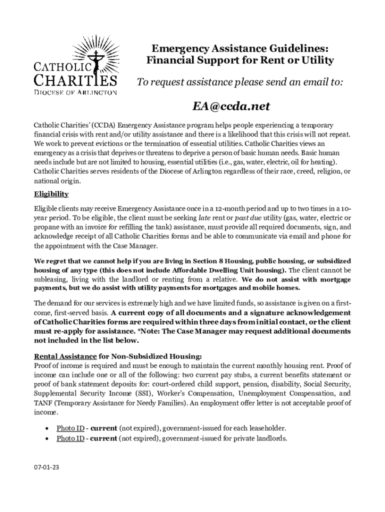 Emergency Assistance Guidelines: Financial Support for Rent or Utility To request assistance please email:Accra.net Catholic Charities (CCD) Emergency Assistance program helps people experiencing