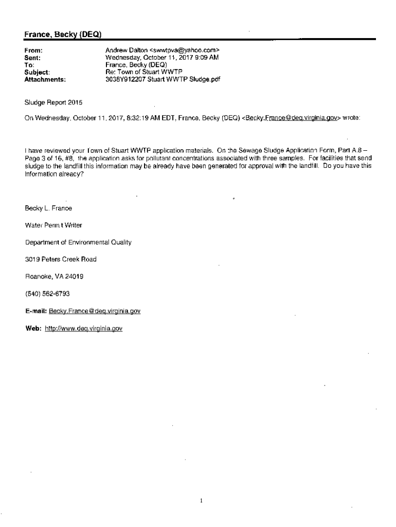 France, Becky (DEQ) From: Sent: To: Subject: Attachments:Andrew Dalton swwtpva@yahoo.com Wednesday, October 11, 2017 9:09 AM France, Becky (DEQ) Re: Town of Stuart WTP 3038Y912207 Stuart WTP Sludge.