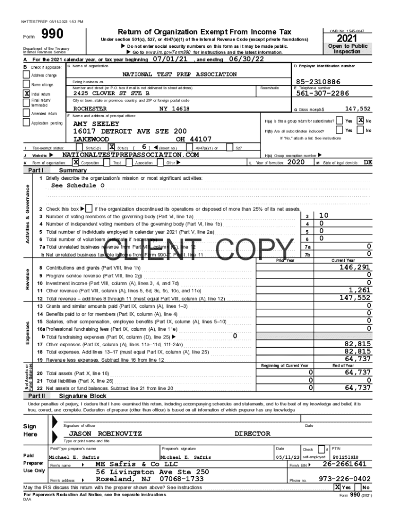NATTESTPREP 05/11/2023 1:53 PMForm990Return of Organization Exempt From Income Department of the Treasury Internal Revenue Service For the 2021 calendar year, or tax year beginning B Check if applicable: