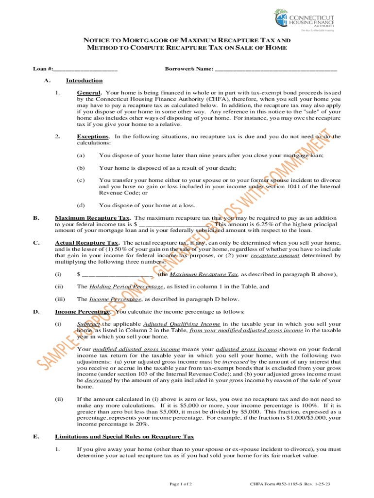 NOTICE TO MORTGAGOR OF MAXIMUM RECAPTURE TAX AND METHOD TO COMPUTE RECAPTURE TAX ON SALE OF HOME Loan #:___A. Borrower/s Name: ___Introduction 1. General. Your home is being financed in whole or in