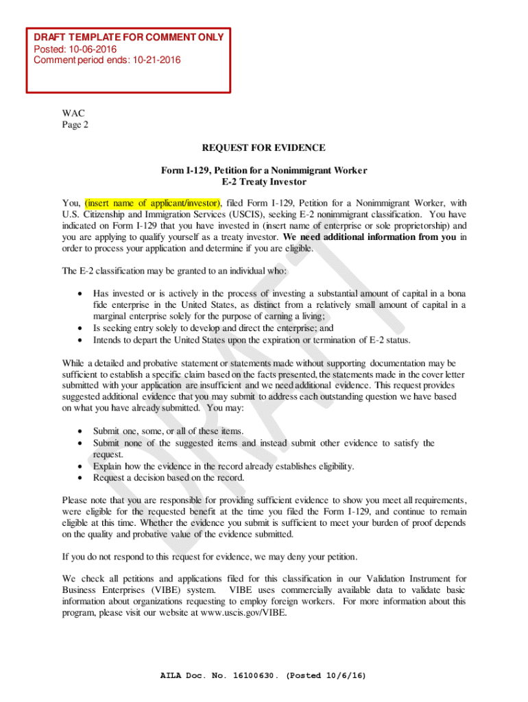 DRAFT TEMPLATE FOR COMMENT ONLY Posted: 10062016 Comment period ends: 10212016WAC Page 2 REQUEST FOR EVIDENCE Form I129, Petition for a Nonimmigrant Worker E2 Treaty Investor You, (insert name of