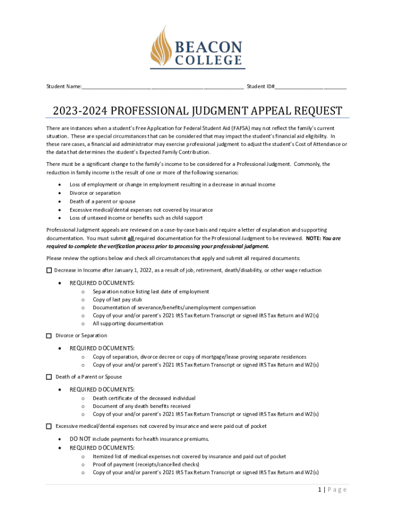 Student Name:___ Student ID#___20232024 PROFESSIONAL JUDGMENT APPEAL REQUEST There are instances when a students Free Application for Federal Student Aid (FAFSA) may not reflect the families current