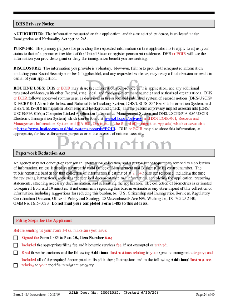 Instructions for Application to Register Permanent Residence or Adjust Status Department of Homeland Security U.S. Citizenship and Immigration ServicesUSCIS Form I485OMB No. 16150023 Expires 10/31/2020Table