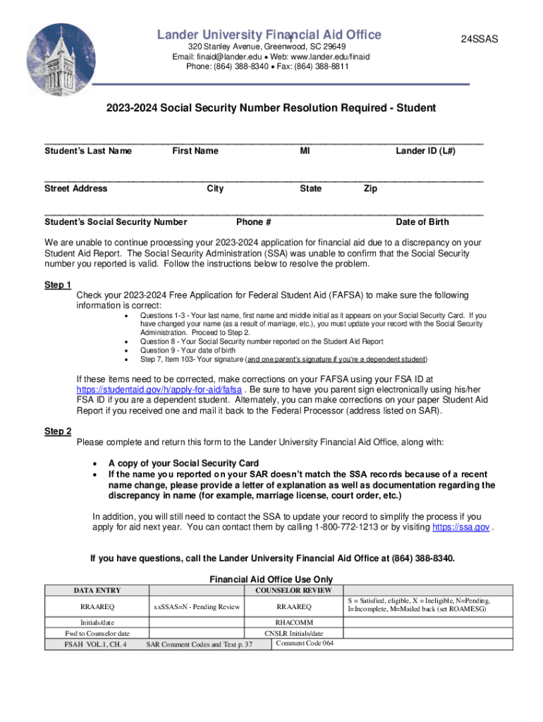 Lander University Financial Aid Office 1 320 Stanley Avenue, Greenwood, SC 29649 Email: finaid@lander.edu Web: www.lander.edu/finaid Phone: (864) 3888340 Fax: (864) 388881124SSAS20232024 Social Security
