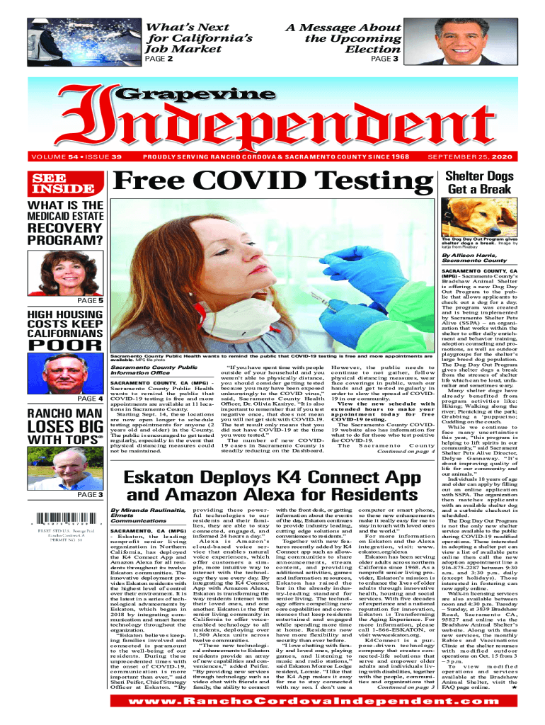 What's Next for California's Job Market Message About the Upcoming Election PAGE 3PAGE 2Independent GrapevineVOLUME 54 ISSUE 39PROUDLY SERVING RANCHO CORDOVA & SACRAMENTO COUNT Y SINCE 1968SEPTEMBER