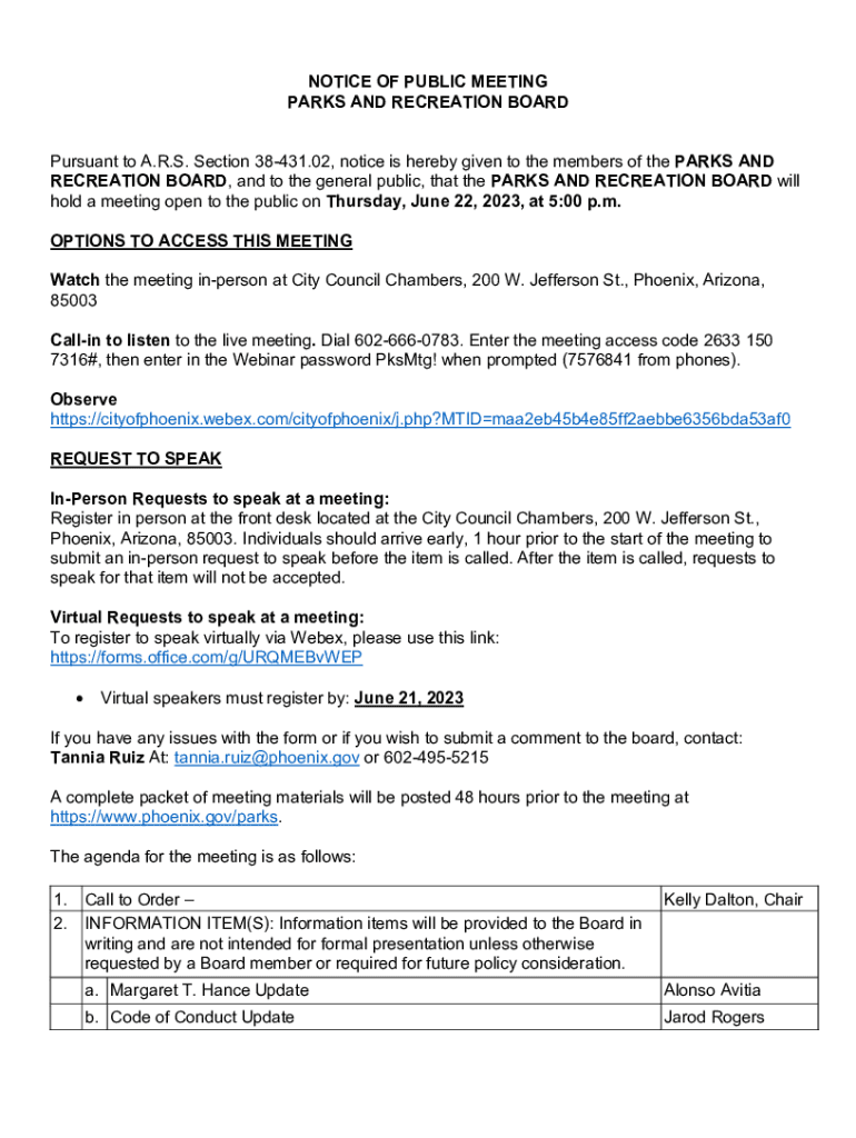 NOTICE OF PUBLIC MEETING PARKS AND RECREATION BOARD Pursuant to A.R.S. Section 38431.02, notice is hereby given to the members of the PARKS AND RECREATION BOARD, and to the public, that the PARKS