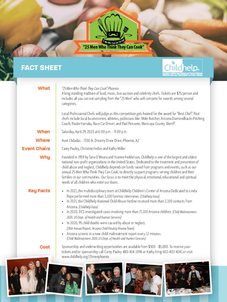25 Men Who Think They Can Cook 3FACT SHEET What25 Men Who Think They Can Cook Phoenix A long-standing tradition of food, music, live auction and celebrity chefs. Tickets are $75/person and includes