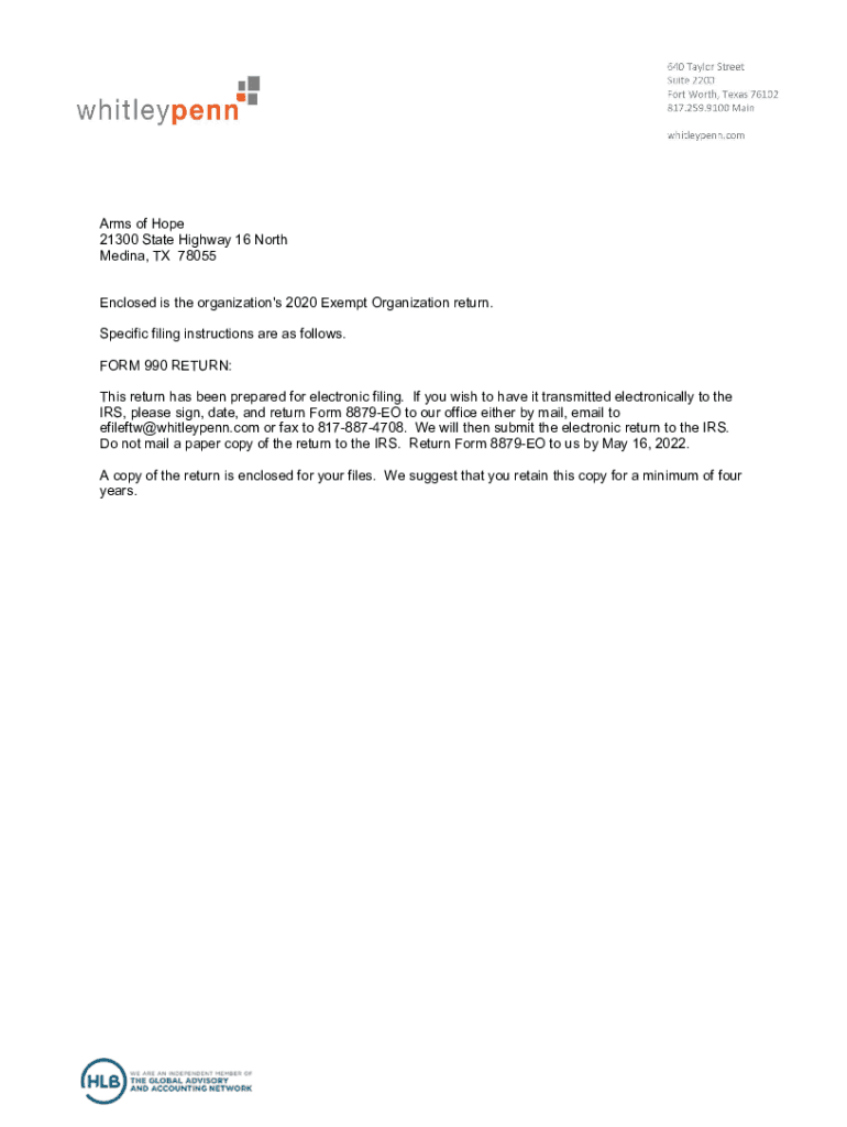 Arms of Hope 21300 State Highway 16 North Medina, TX 78055 Enclosed is the organization\'s 2020 Exempt Organization return. Specific filing instructions are as follows. FORM 990 RETURN: This return